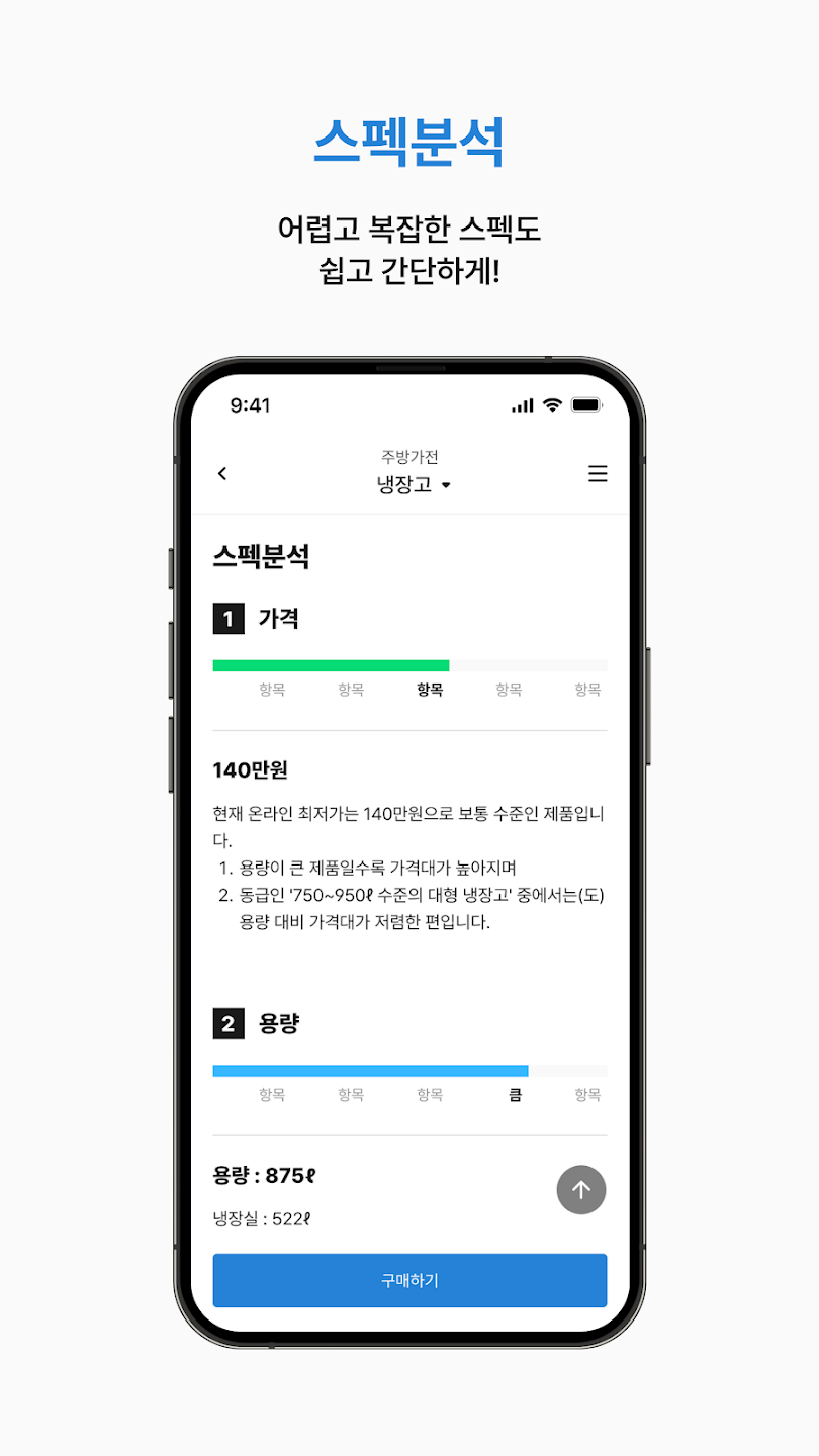 위에 추가한 앱스토어를 방문해서 노써치 어플을 설치하면 모바일에 특화된 사용자 편의성을 고려한 UI를 활용하여 간편하게 사용할 수 있는데, 특히 가전제품을 구매할 때 꼭 필요한 정보 및 전문용어를 쉽게 이해할 수 있도록 제공하므로 소비자들이 별다른 어려움없이 원하는 가전제품을 선택할 수 있다.