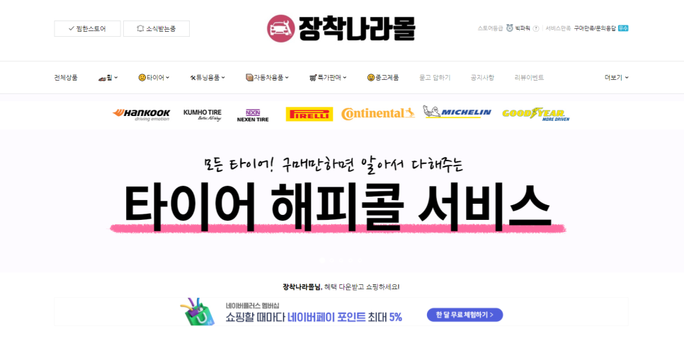 위의 이미지를 누르면 장착나라 홈페이지로 전환하는데, 여기에서 타이어를 구매하는 방식이 아니라 국내에서 활성화된 쿠팡을 비롯하여 지마켓, 11번가, 옥션, 네이버 쇼핑 등 대형 온라인 쇼핑몰에서 타이어를 구매하는 방식으로 이용이 가능하다.