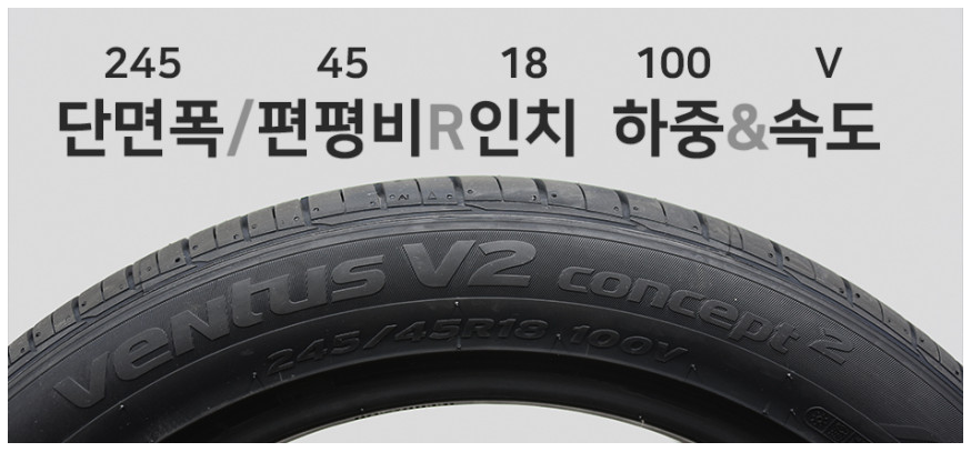타이어 사이즈를 체크하려면 상기 이미지에서 보듯이 타이어 옆면에 3자리 숫자와 2자리 숫자 그리고 R 2자리로 구성되어 있는 부분이 나온다. 해당 부분이 바로 타이어 사이즈를 지칭하는데, 이를 토대로 인터넷에서 동일한 사이즈의 타이어를 주문하면 된다.