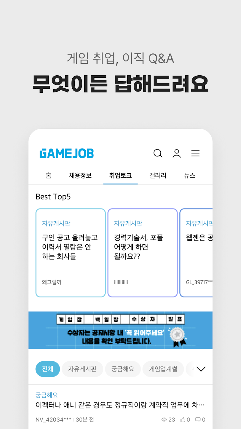 위에 추가한 앱스토어를 방문해서 게임잡을 설치하면 모바일에 특화된 사용자 편의성을 고려한 UI를 활용하여 간편하게 원하는 일자리를 검색할 수 있는데, 특히 게임잡 커뮤니티에서 현직에 있는 이들의 취업 및 면접후기 등을 볼 수 있을 뿐만 아니라 직접 글을 올려서 소통도 가능하다. 추가로 현재 게임 업계 관련 뉴스를 일목요연하게 제공하므로, 게임 업계 트렌드 및 현황까지 한눈에 파악할 수 있다.