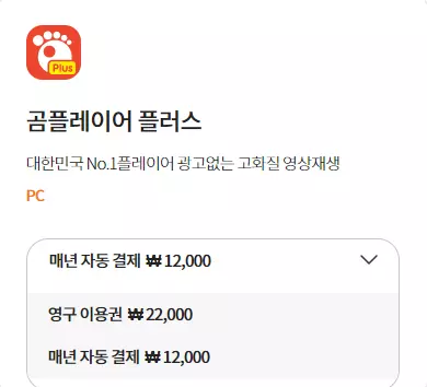 곰플레이어 플러스는 광고를 제거할 뿐만 아니라 기존 곰플레이어 무료 버전에서 제공하는 모든 기능에 추가로 4K, UHD 영상을 끊김 없이 재생할 수 있다. 해당 곰플레이어 플러스를 구독 시에는 가급적 1번 구매하면 평생 동안 추가 비용이 없는 영구 이용권을 구매하는 게 경제적이다.