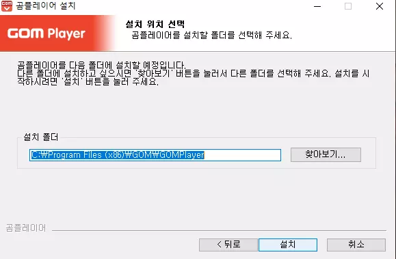 이후 곰플레이어를 설치할 폴더를 지정할 수 있는 데, 원하는 폴더를 선택하거나 기본값 상태로 동의 버튼을 누르면 해당 곰플레이어를 빠르게 설치한 후에 완료 팝업이 나타난다. 여기에서 마침 버튼을 눌러서 곰플레이어 설치 작업을 정상적으로 종료하면 된다.