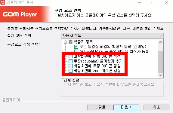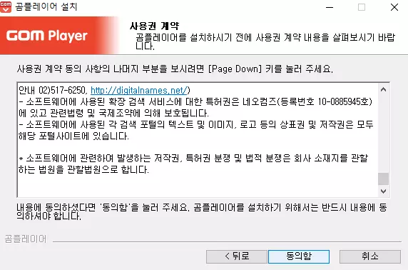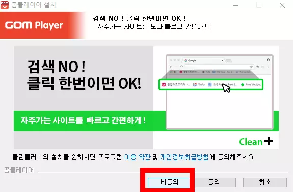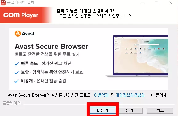이때 추가로 설치하는 제휴 프로그램이 여러 개 나오는데, 해당 프로그램은 PC 사용에는 큰 영향이 없는 유틸리티이지만 필요 시에 따로 설치가 가능하므로 여기에서는 비동의 버튼을 눌러서 넘겨도 곰플레이어 설치와는 무관하다.