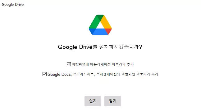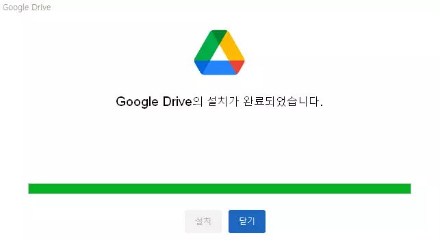처음에 해당 설치파일을 실행하면 "이 앱이 디바이스를 변경하도록 허락하시겠어요?"라는 팝업이 나오면 예를 누른다. 다음으로 설치팝업에서 원하는 항목에 체크한 후에 설치 버튼을 눌러 진행한다. 그러면 별다른 과정 없이 빠르게 해당 구글 드라이브를 컴퓨터에 설치하고 완료 팝업을 띄우는데, 여기에서 닫기 버튼을 눌러서 구글 드라이브 PC 버전 설치를 정상적으로 종료한다.