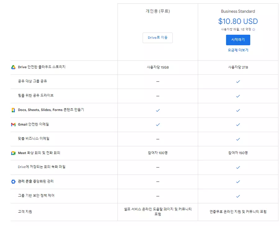 즉, 개인 사용자라면 구글 드라이브를 무료 또는 유료로 구독하면 되고 팀 단위라면 유료 버전의 구들 드라이브가 아닌 구를 워크스페이스를 유료로 구독하는 게 일반적이다.