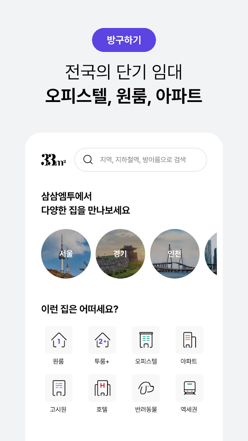 단기 임대 오피스텔 원룸 투룸 아파트를 찾고 계신가요? 쉽고 빠르고 안전한 단기 임대 플랫폼, 33m2에서 계약하세요.