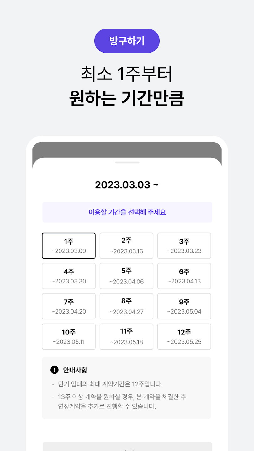 잠깐 살 집 필요할 땐, 단기임대 No.1 삼삼엠투 ● 딱 필요한 기간 만큼 · 전국의 원룸, 오피스텔, 아파트부터 · 레지던스, 호텔, 고시텔, 펜션까지 · 최소 1주부터 필요한 만큼 계약 가능 ● 합