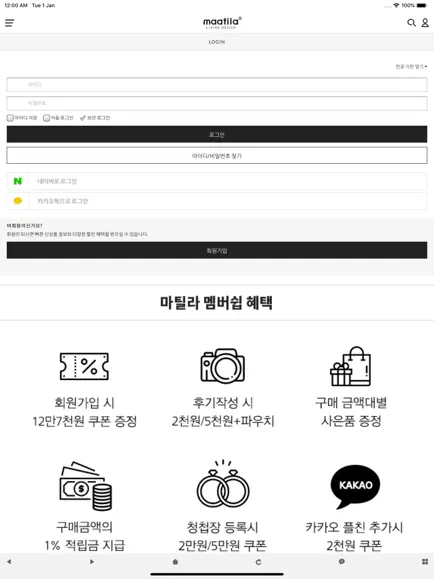 마틸라는 기본적으로 쇼핑몰이므로 회원가입 후에 이용할 수 있는데, 카카오톡과 연동되므로 기존 카카오 계정으로 바로 마틸라 계정을 생성해서 로그인할 수 있다. 카카오 계정 이외에 네이버, 애플 계정과도 연동되며 마틸라 계정을 생성하지 않고 비회원 상태로도 이용할 수 있지만, 가능하면 회원가입 후에 이용하는 방식을 추천한다.