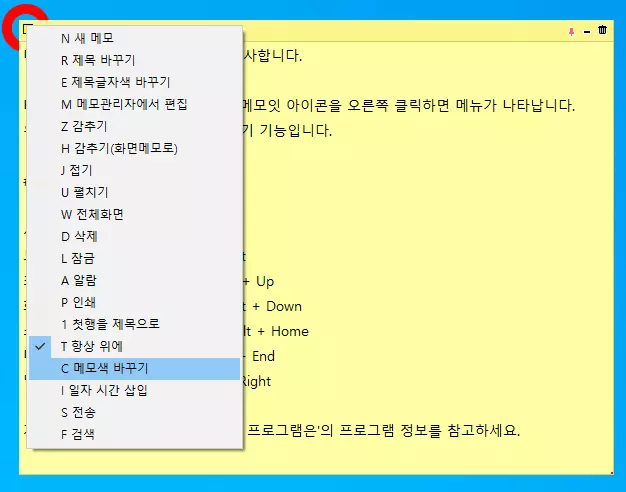 메모잇 프로그램에서 최상단 좌측에 있는 아이콘을 누르면 다양한 메뉴가 나오는데, 해당 메뉴에서 원하는 기능을 선택해 사용하면 되는데 처음에는 메모색 바꾸기와 글자쌕 바꾸기 등 자신의 스타일에 맞게 설정할 필요가 있다.