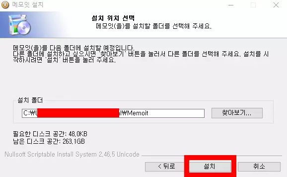 다음으로 메모잇을 설치할 폴더를 지정할 수 있는데 기본값 상태로 설치를 진행하는 것을 추천한다. 메모잇을 설치할 폴더를 변경하는 것은 가능하지만 윈도우를 설치한 기본 드라이브가 아니라 다른 드라이브에 메모잇을 설치하면 제대로 동작하지 않을 수 있다.