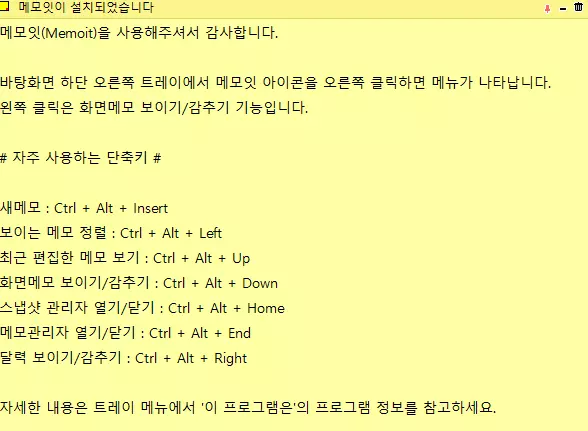 그러면 아래와 같이 심플한 포스트잇 UI를 지닌 메모잇이 나타난다. 또한 첫 화면에 메모잇을 사용하는 가장 기본적인 내용이 담겨 있으므로, 해당 부분만이라도 최소한 읽어 보고 사용하는 것을 추천한다.