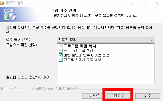 이후 사용권 계약 팝업이 나오는데 해당 메모잇은 누구나 무료로 사용이 가능한 프리웨어이므로 동의함 버튼을 누른 후에, 구성 요소 선택 팝업이 나오는데 여기에서 필요한 항목만 체크한 후에 다음 버튼을 누른다. 개인적으로는 바탕화면에 단축 아이콘 생성만 체크하고 나머지 항목은 체크를 해제했는데, 컴퓨터 실행 시에 메모장을 나오게 하려면 윈도우 시작 시 자동 실행 항목을 체크하면 된다.