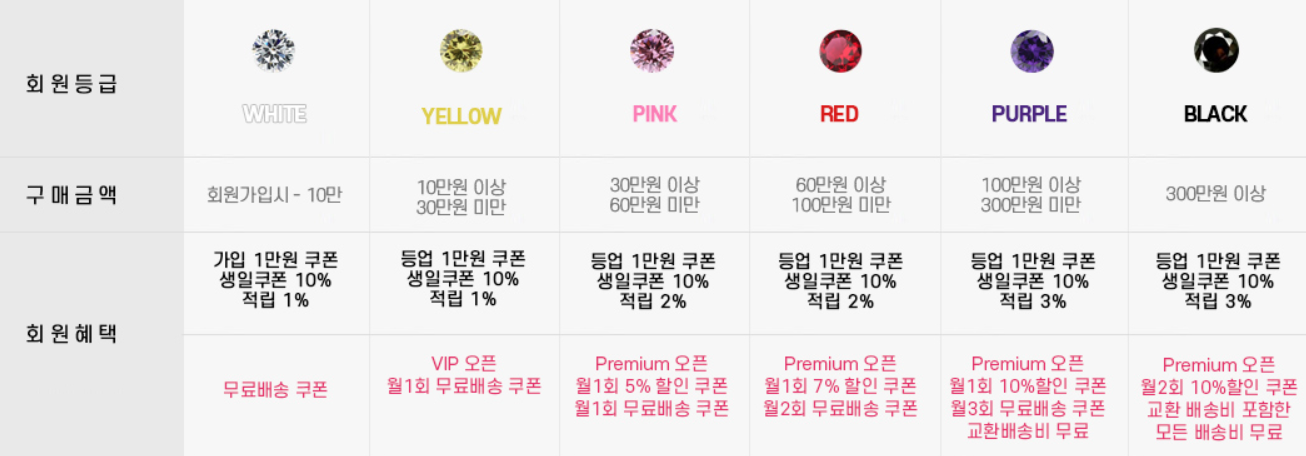 해당 고니샵 쇼핑몰은 최근 6개월간 구매 실적에 따라 화이트부터 엘로우, 핑크, 레드, 퍼플, 블랙 등급까지 구분한 회원 등급별로 차별적인 혜택을 제공하는데, 기본적으로 상품 배송 시 3000원 배송비가 책정되는데 7만원 이상 묶음 구매 시에는 무료 배송 혜택을 받을 수 있다. 더불어 엘로우 등급 이상부터는 매월마다 무료 배송 쿠폰을 제공하므로 더욱 경제적인 쇼핑이 가능하다.