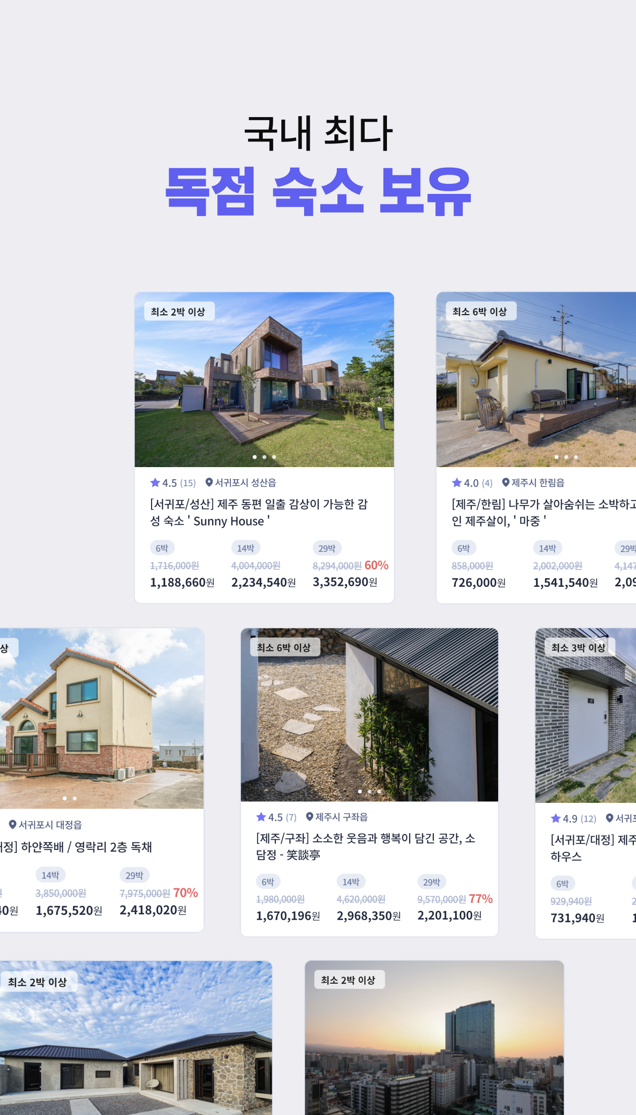 사람들은 누구나 쉼을 필요로 합니다. 바쁜 여행이 아닌 여러분이 사는곳을 일주일이상 혹은 한 달간 잠시 바꿔 보는건 어떨까요? 현재 제주도를 시작으로 전국 그리고 해외까지 서비스를 확