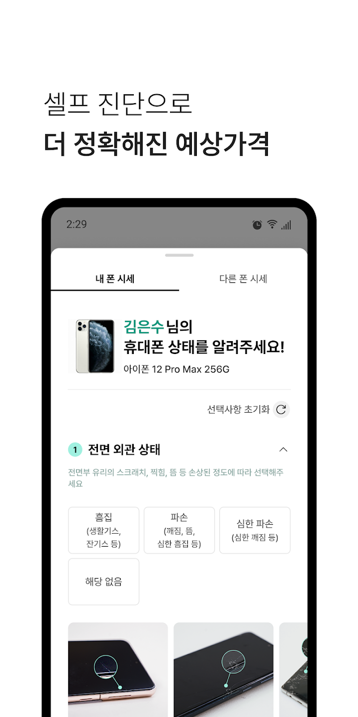 위에 추가한 앱스토어를 방문해서 민팃 어플을 설치하면 셀프진단으로 현재 폰 시세를 조회하거나 민팃을 이용하는 방법을 앱 상에서 간편하게 확인할 수 있다.