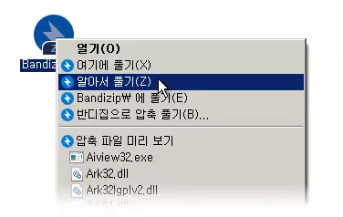 앞에서 소개한 윈도우용 반디집을 설치형을 다운로드하든 포터블 버전을 다운로드하든 사용 방법은 동일하다. 일반적으로 반디집은 압축을 풀 파일 위에 마우스를 올린 후에 우측 버튼을 눌러서 알아서 풀기를 사용한다.