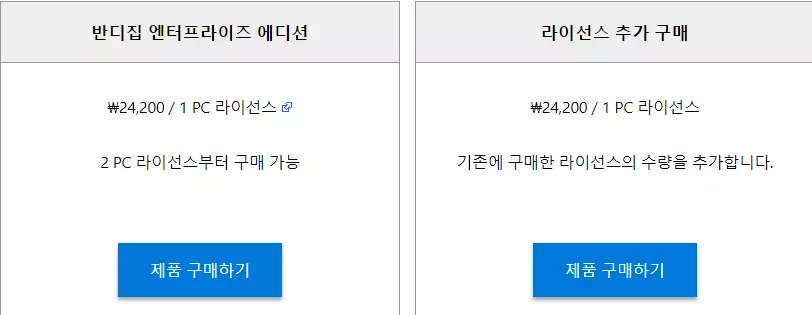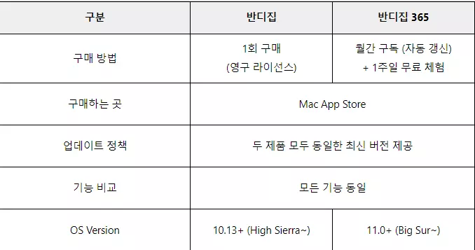 위와 같이 반디집 엔터프라이즈 에디션은 기업 사용자를 대상으로 유료로 판매하는 제품으로 PC당 라이선스를 구매해야 한다. 이외 개인용으로 유료 버전인 프로페셔널 에디션도 판매하고 있다. 앞서 언급했듯이 무료 버전을 제공하는 윈도우용과 달리 맥용은 모두 유료 제품인데, 반디집을 한 번 구매하면 영구적으로 사용할 수 있는 버전과 월간 구독료를 지불하는 버전으로 제공하고 있다. 참고로, 맥용으로 제공하는 2가지 버전은 구매 방법만 다를 뿐 기능은 모두 동일하다.