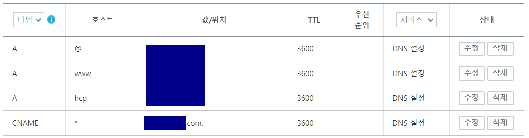 대부분 기존 도메인을 구매한 사이트에서 DNS 관리 페이지로 접속하면 @, www, plesk 호스트 항목이 A타입에 값에 기존 숫자로 된 IP가 있는데, 바로 해당 IP 주소로 새로운 인스턴스 IP 주소로 변경하면 된다. 더불어 plesk 대신에 헤스티아를 사용하므로 plesk를 hcp로 바꿔주면 된다.