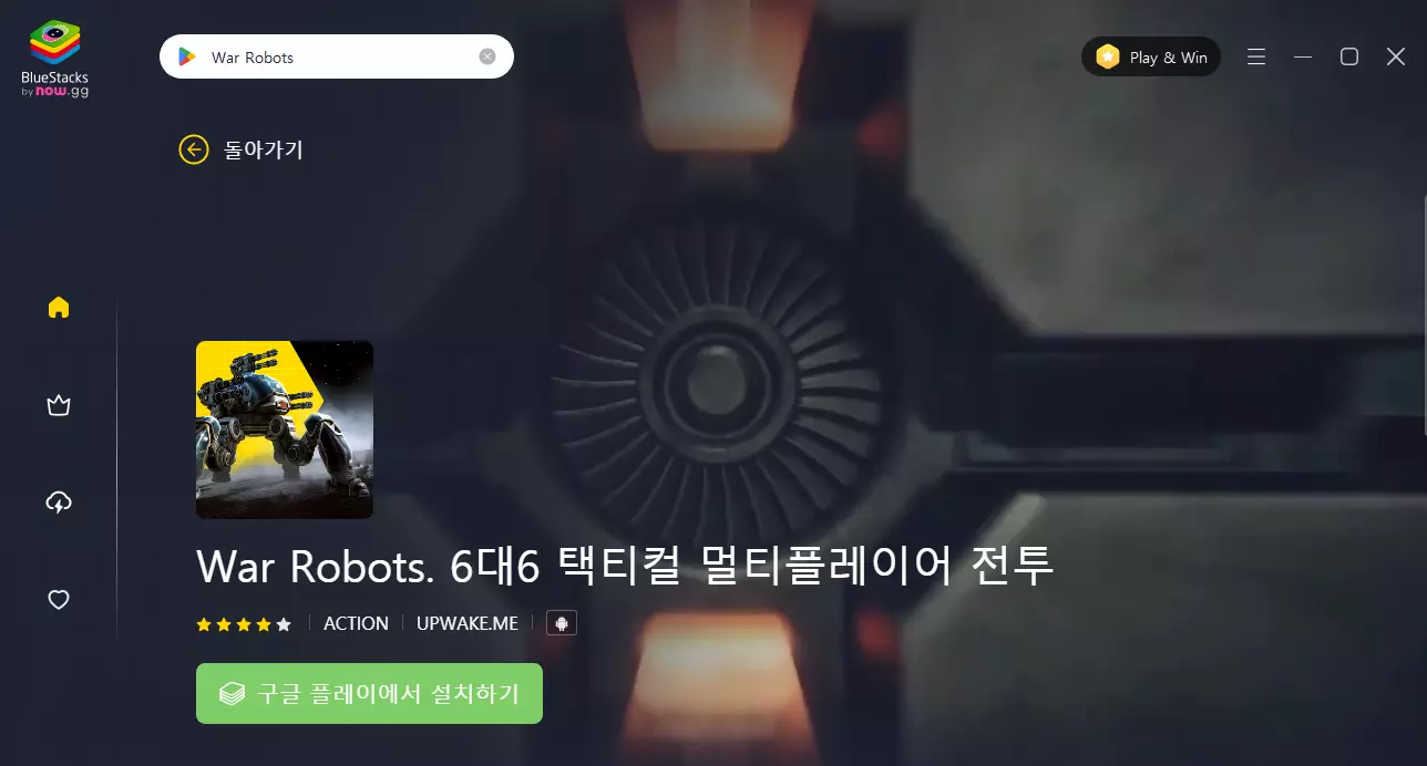 여기에서는 실제 사용 방법을 예시로 들고자 War Robots라는 6대6 택티컬 멀티플레이어 전투를 검색했다. 그러면 구글 플레이에서 설치하기 버튼이 나오는데 해당 버튼을 누른다.