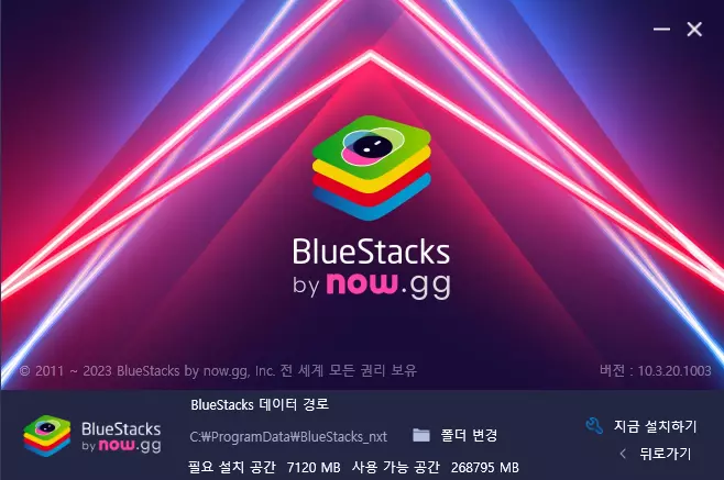 해당 설치파일을 실행하면 처음에 "이 앱이 디바이스를 변경하도록 허락하시겠어요?"라는 팝업이 나오면 "예"를 누른다. 그러면 블루스택 설치 화면이 나오는데 기본값으로 동의 항목이 체크된 상태이므로 지금 설치하기 버튼을 눌러 윈도우용 PC에 설치를 진행하면 된다. 참고로, 사용자 지정 항목을 눌러 블루스택을 설치할 폴더를 변경한 후에 설치를 진행해도 무방하다.