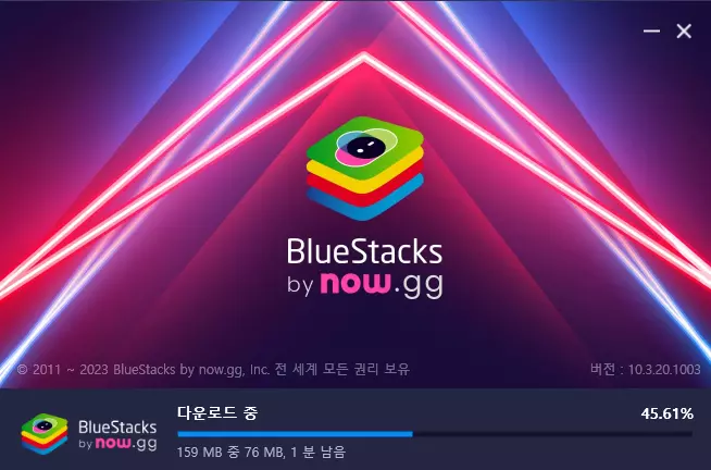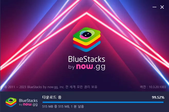 그러면 블루스택 설치를 진행하는데 파일을 다운로드하고 압축을 푸는 등 자동으로 설치 과정을 진행하는데, 설치 시에 약간 시간이 소요되지만 그렇다고 지루할 만큼 긴 시간은 아니다.