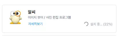그런 후에 알매니저 프로그램을 실행한 상태에서 알씨 설치 팝업이 나오는데, 여기에서 설치를 시작합니다 버튼을 누른다. 그러면 알매니저 UI에 있는 알씨 항목에서 설치 진행률이 나온다.