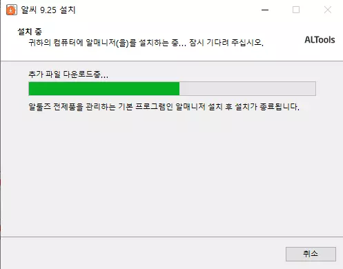 위와 같이 다운로드한 알씨 설치파일을 더블클릭하면 "이 앱이 디바이스를 변경하도록 허락하시겠어요?"라는 팝업이 나오면 예를 누른다. 이후 알씨 사용권 계약 팝업이 보이면 동의 버튼을 누른다. 만약 최근에 알툴즈에 포함된 다른 프로그램을 설치한 적이 없다면 알매니저 설치를 자동으로 진행한다.