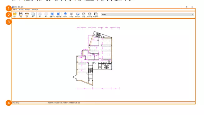 알씨 캐드뷰어 UI에서 1번 메뉴 영역과 3번 뷰어 영역이 중심이다. 알씨 캐드 뷰어의 기능이 담긴 1번 메뉴 영역에는 기능의 속성에 따라 분류되어 있다. 순서대로 캐드 파일을 불러오거나 저장하고 인쇄 항목까지 담긴 파일, UI를 확대 축소할 수 있는 보기, 옵션, 도움말로 구성된다. 이러한 1번 영역에서 자주 사용하는 기능만을 모아논 게 2번 영역의 툴바이다. 3번 뷰어 영역은 캐드 파일을 열었을 때 나타나는 공간이며, 4번 영역은 파일 정보 등이 나타나는 상태바이다.