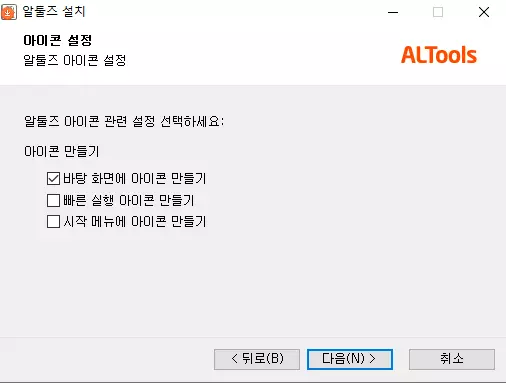 다음으로 아이콘 설정 팝업이 나오는데 여기에서 바로가기 아이콘 항목 중 필요한 항목만 체크하고 나머지 항목은 체크를 해제한 후에 다음 버튼을 누른다. 이후 설치 준비 팝업에서 앞에서 세팅한 항목이 맞는지 확인 후에 설치 버튼을 누른다.