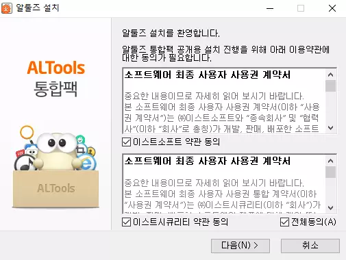 이후 알툴즈 통합팩 설치 팝업이 나오는데 여기에서 사용권 계약서 2군데 약관 동의 항목을 체크하고 다음 버튼을 누른다. 다음으로 알툴즈를 설치할 폴더를 선택할 수 있는 팝업이 나오면 찾아보기를 눌러서 설치할 폴더를 지정하거나 기본값 상태에서 다음 버튼을 누른다.