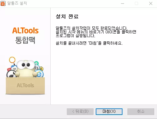 그러면 설치 항목을 체크한 알툴즈 내 유틸리티들을 순차적으로 빠르게 설치를 진행한 후에 설치 완료 팝업을 띄운다. 여기에서 마침 버튼을 눌러 설치 작업을 정상적으로 종료한다.