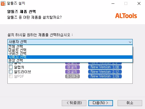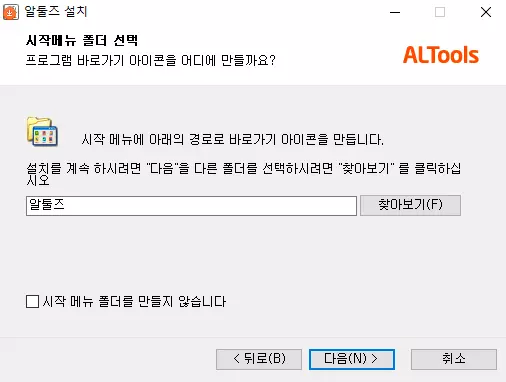 그러면 알툴즈 내 포함된 7가지 유틸리티를 전체 또는 선택적으로 설치할 수 있는데, 설치할 유틸리티를 체크한 후에 다음 버튼을 누른다. 이후 시작메뉴 폴더명을 임의로 기재하거나 기본값 상태로 다음 버튼을 누른다.