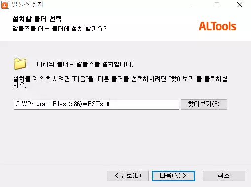 이후 알툴즈 통합팩 설치 팝업이 나오는데 여기에서 사용권 계약서 2군데 약관 동의 항목을 체크하고 다음 버튼을 누른다. 다음으로 알툴즈를 설치할 폴더를 선택할 수 있는 팝업이 나오면 찾아보기를 눌러서 설치할 폴더를 지정하거나 기본값 상태에서 다음 버튼을 누른다.