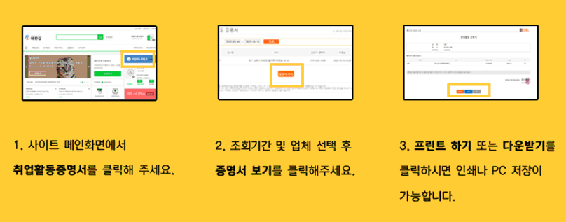더불어 애완잡에서는 온라인 입사지원 시 컴퓨터, 모바일 어디에서나 간단하게 취업활동증명서를 즉시 발급받을 수 있는데, 온라인 입사 지원하기를 한 후에 사이트 메인 페이지에서 취업활동 증명서를 눌러서 업체를 선택한 후에 증명서 보기를 누르면 해당 취업활동 증명서가 나타난다. 여기에서 다운받기 또는 인쇄하기를 선택해서 원하는 용도로 사용하면 된다. 아래의 이미지를 참조하면 조금 더 수월하게 취업활동증명서를 발급받을 수 있다.