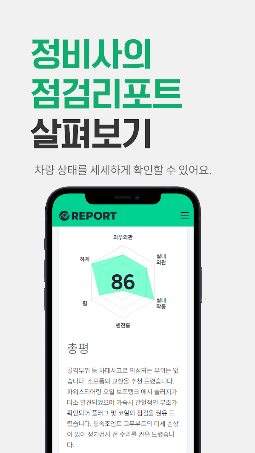 상기에 링크한 카바조 매뉴얼 보기 버튼을 누르면 카바조 서비스 특징을 비롯하여 예약 방법 그리고 검수 비용까지 일목요연하게 정리된 항목별로 살펴볼 수 있다. 더불어 검수 후에 받게 되는 리포트 양식 예시도 확인할 수 있는데, 여기에는 상세한 차량 검수 결과를 담고 있는데, 고객의 편의를 도모할 수 있도록 전면에 구매에 적합한 지를 요약해서 제공하므로 더욱 빠르게 중고차 구매 여부를 결정할 수 있다.