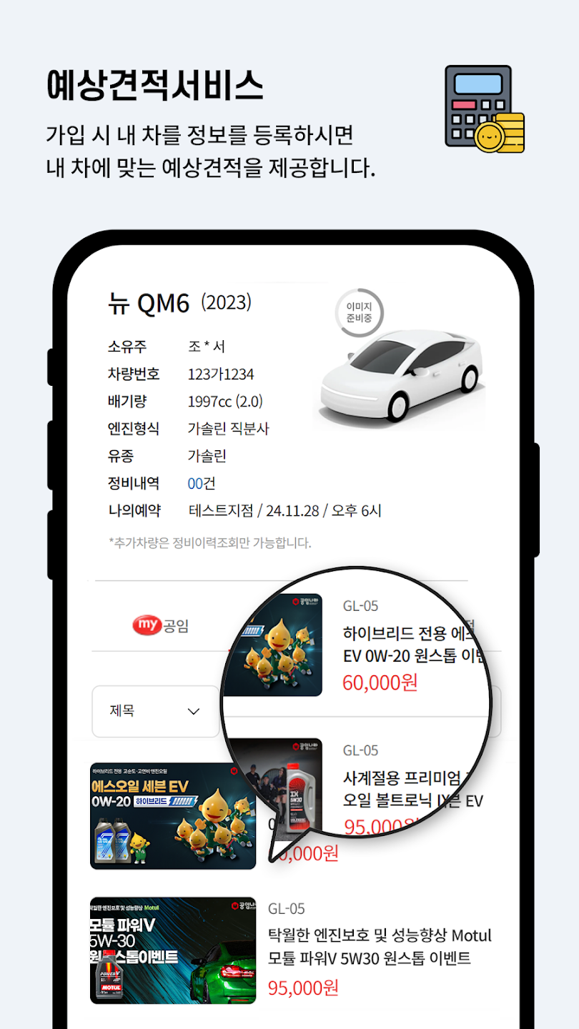 위에 추가한 앱스토어를 방문해서 공임나라 어플을 설치하면 모바일에 특화된 사용자 편의성을 고려한 UI를 활용하여 간편하게 사용할 수 있는데, 특히 자동차 정비 예약 전에 앱에서 예상 견적 서비스를 받아볼 수 있을 뿐만 아니라 그동안 정비한 내역까지 확인할 수 있어 매우 유용하다.
