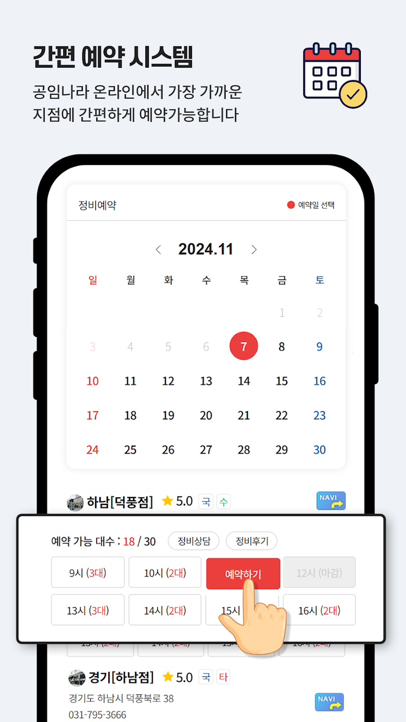 위에 추가한 구글 플레이스토어를 방문해서 공임나라 앱을 설치하면 차량 운행 중에도 간편하게 주변에 위치한 공임나라 지점을 앱에서 찾아서 예약 후에 바로 이용할 수 있어 매우 편의성이 뛰어나다.