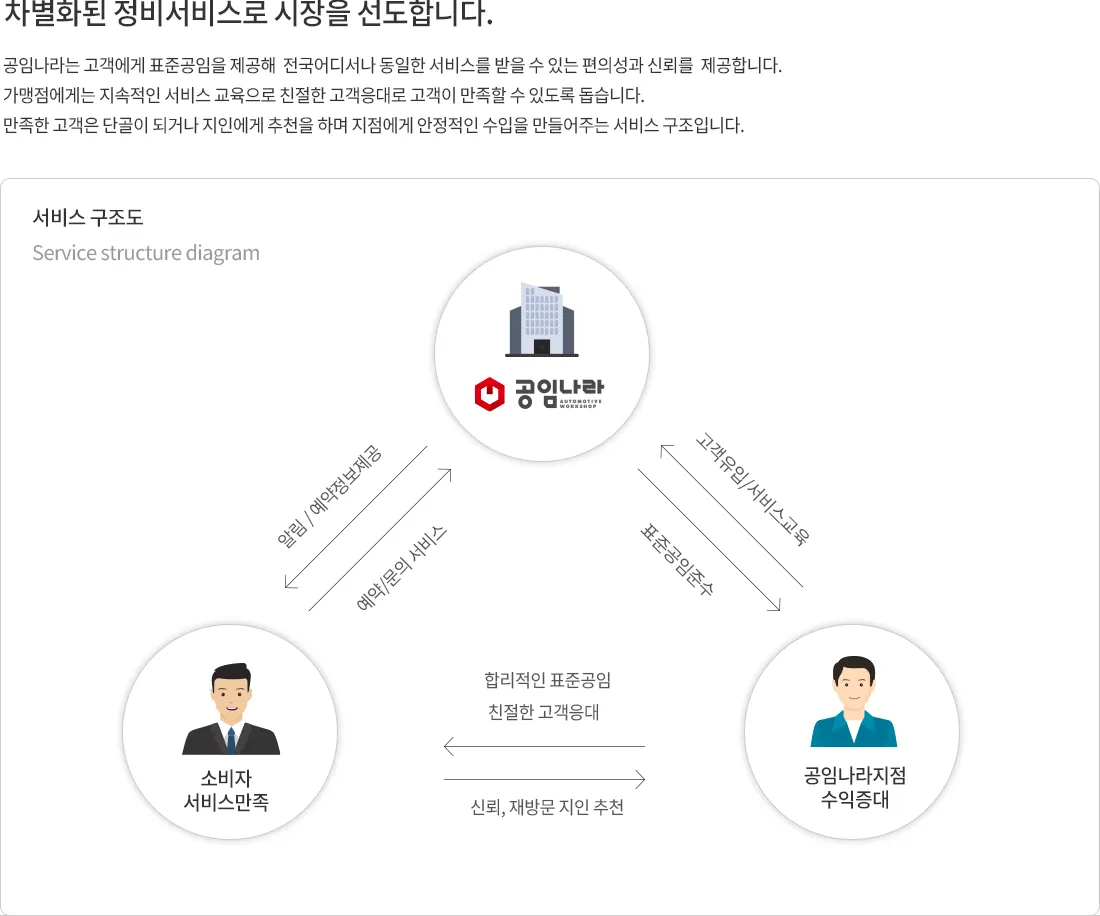 자동차 정비 시 표준공임을 준수하는 전국 지점 형태로 운영하는 공임나라는 온라인에서 구매한 오일, 부품, 용품까지 안심하고 교환 장착할 수 있는 자동차 정비 프랜차이즈이다.