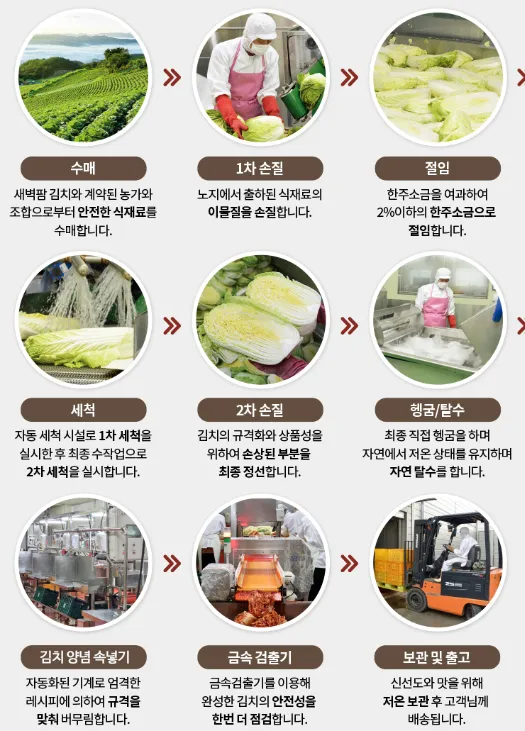 참고로, 새벽팜에서 김치를 제조하는 과정은 상기 이미지와 같이 수매부터 절임 그리고 출고까지 위생적이며 과학적인 프로세스로 진행하고 있는데, 앞에서 언급했듯이 HACCP 기준의 위생적 생산하는 HACCP 인증 받은 위해요소 중점관리 우수식품이다.