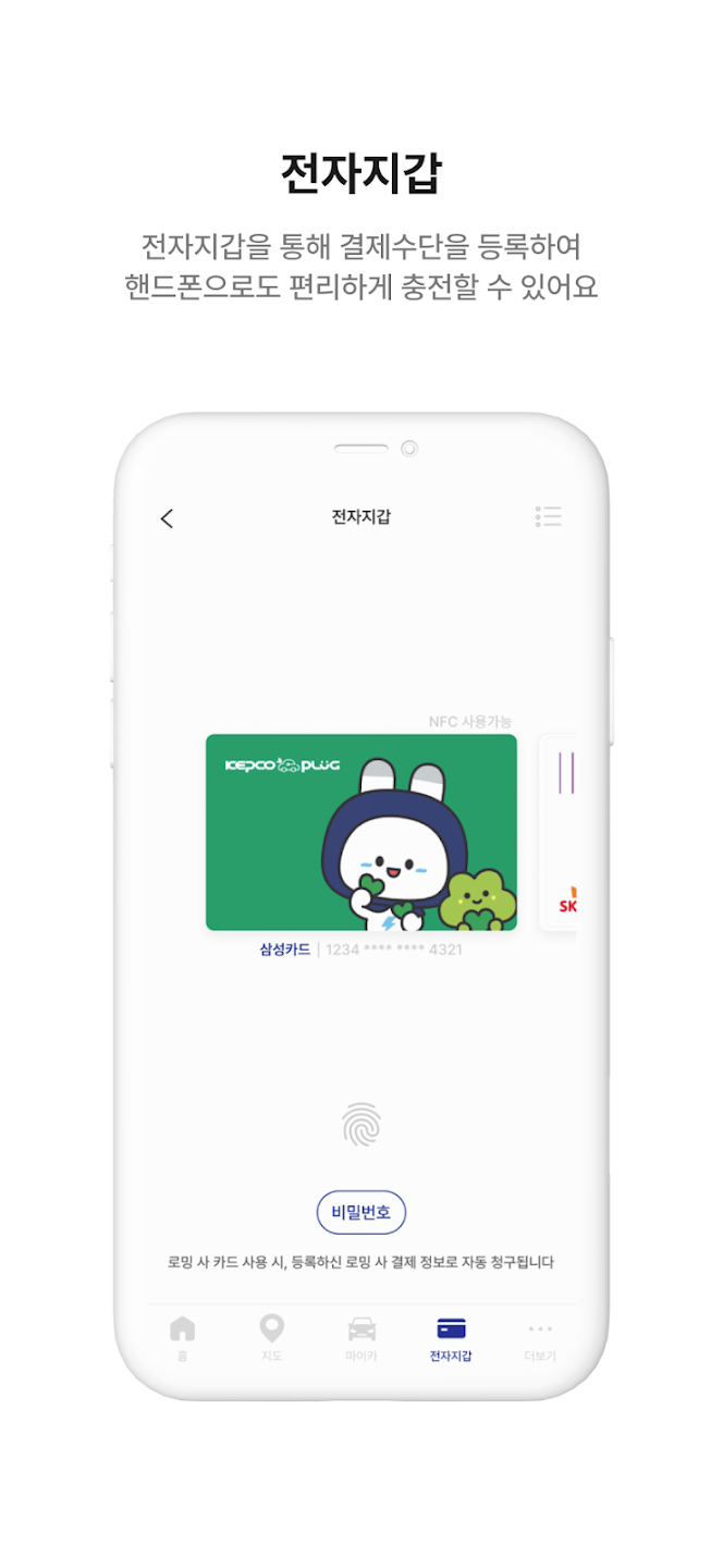 더불어 실시간 충전 진행률을 확인할 수 있을 뿐만 아니라 모바일 앱으로 충전 시작 및 종료 알림 서비스를 받을 수 있다. 이외에도 그동안 충전한 내역을 조회하거나 통계 정보로 간편하게 살펴볼 수 있고, 타사의 회원카드까지 담을 수 있는 전자지갑 기능을 활용하여 더욱 간편한 충전요금 결제 서비스를 이용할 수 있다. 참고로, 회원이 아닌 비회원도 해당 앱으로 주변의 충전소 위치 및 상태를 검색할 수 있고, 충전 시에 요금 정보를 비롯하여 충전 진행률도 살펴볼 수 있다.