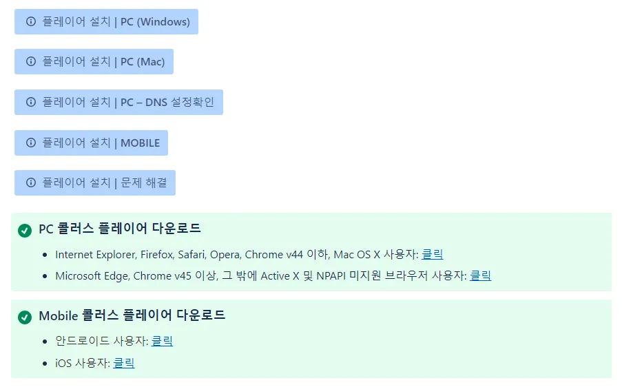 콜러스 플레이어 다운로드 페이지에서는 위와 같이 각각의 운영체계별로 해당하는 콜러스 플레이어를 다운로드할 수 있다.