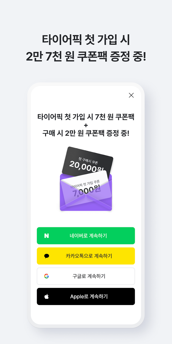 위의 이미지를 누르면 타이어픽 홈페이지로 전환하는데, 여기에서 기존 네이버 계정을 비롯하여 카카오톡, 구글 계정 등과 연계해서 간편하게 회원 가입 후에 바로 이용이 가능하다.