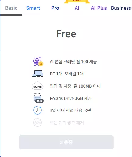 클라우드 폴라리스 오피스를 설치 시에 무료로 사용하는 Basic 버전이므로 업그레이드를 하지 않으면 계속 무료로 사용이 가능하다.