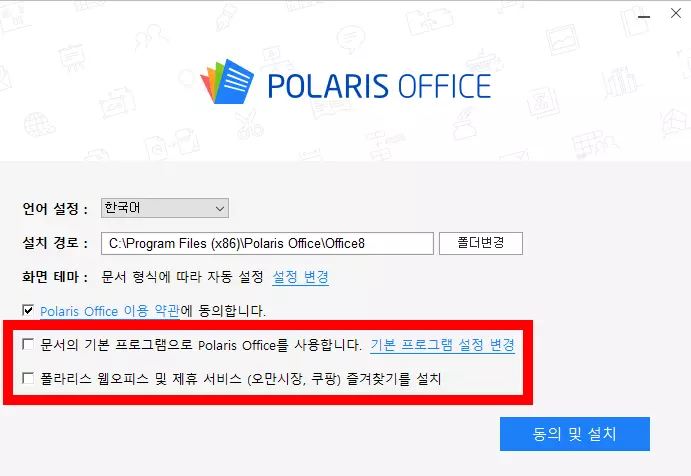 다음으로 폴라리스 오피스 설치 팝업이 나오는데 여기에서 설치할 경로를 지정하거나 기본값 상태로 진행하면 된다. 이때 하단 항목 중에 제휴 서비스 추가가 있으므로 해당 부분은 반드시 체크를 해제해야 한다. 더불어 폴라리스 오피스 이외에 다른 문서 프로그램이 있다면 기본 프로그램 항목도 체크를 해제한 후에 동의 및 설치 버튼을 눌러 설치를 진행한다. 즉, 폴라리스 오피스 이용약관만 체크된 상태에서 동의 및 설치 버튼을 누르면 된다.