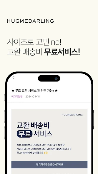 앞에서 살펴본 대로 자체 제작한 프리미엄 잠옷 브랜드인 허그미달링은 휴식 시간부터 일상 생활까지 더욱 편안함을 제공하는데, 회원에 한해 무료 교환 서비스를 제공하고 있다. 이는 직접 피티해보고 구매할 수 없는 온라인 특성상 사이즈가 맞지 않는 일이 발생할 수 있기 때문이다.