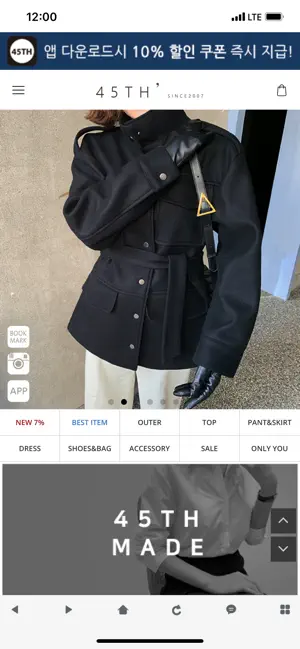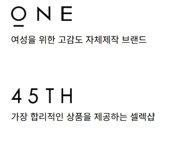 자제 제작 브랜드인 ONE부터 하이퀄리티 명품 스타일 여성 의류를 선별해서 제공하는 셀렉샵까지 운영하는 여성의류쇼핑몰인 45번가를 살펴본다. 20대부터 40대까지 여성을 주요 고객층으로 모던 시크 의류를 비롯해서 세련된 스타일의 여성 의류를 제공하는 45번가는 특히 직장 여성 즉, 커리어우먼과 데일리룩에 적합한 과하지 않은 세련된 스타일의 의류를 가성비 좋은 가격으로 제공하고 있다.