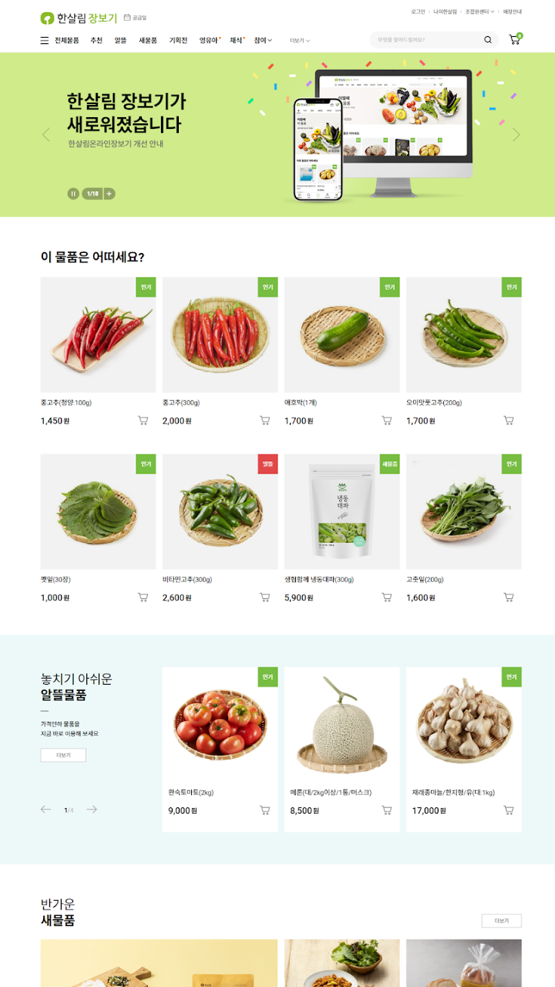 위의 이미지를 누르면 한살림 장보기 웹사이트로 전환하는데, 만약 제대로 연결되지 않는다면 아래에 추가한 한살림 장보기 바로가기 버튼을 누르거나 포털사이트에서 검색해서 방문하면 된다.