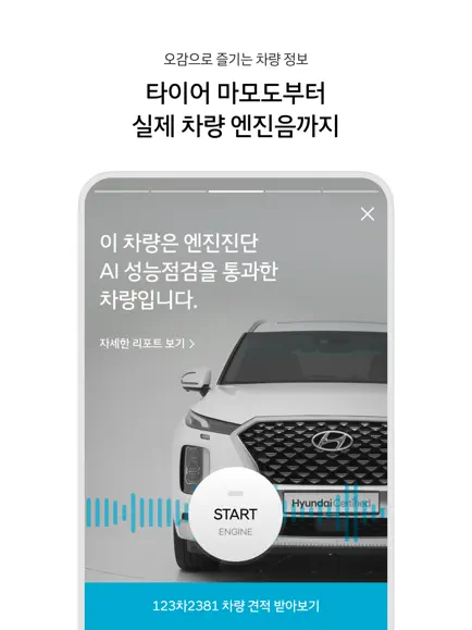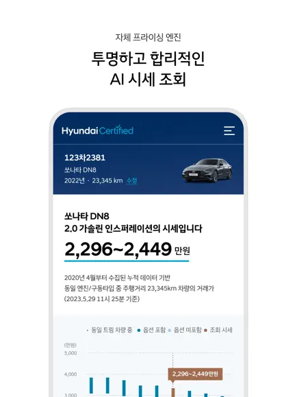 Made by us, Cared by us. Hyundai Certified 현대자동차가 만든 투명하고 정직한 인증중고차 서비스 ■ 쉽고 빠른, 내 차 팔기 1) AI 기반의 자체 프라이싱 엔진, 현대자동차의 노하우를 담아 투명하고 정