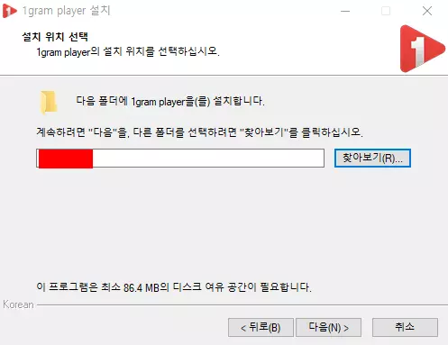 그러면 1그램 플레이어를 설치할 경로를 지정할 수 있는 팝업이 나오는데, 여기에서 설치할 폴더를 지정하거나 기본값 상태로 다음 버튼을 누른다. 이후 구성 요소 선택 팝업이 나오는데 비활성화된 필수 항목 이외에 나머지 항목은 개인적인 취향에 따라 체크 또는 해제하면 된다.