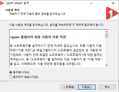 이후 1그램 플레이어 설치 마법사 팝업이 나오는데 여기에서 다음 버튼을 누른 다음에 사용권 계약 팝업이 나오면 동의합니다 항목에 체크한 후 다음 버튼을 눌러 진행한다.